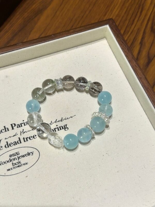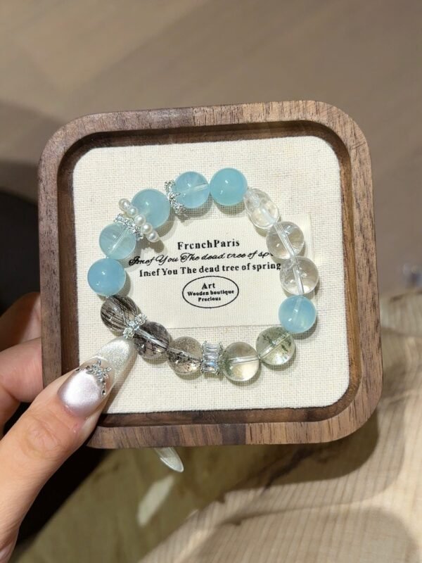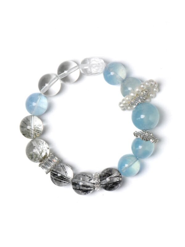 This bracelet is tailor-made for those whose Five Elements favor Metal and Water. The bracelet features large aquamarine beads, creating a vibrant, translucent hue that evokes a glimpse into the azure waters of the deep ocean. It’s complemented by a small selection of black rutilated quartz, white crystal, and green phantom gemstones, accented with a small white crystal Pixiu and natural pearls, showcasing ingenious details.
