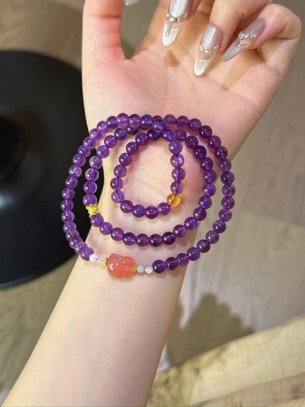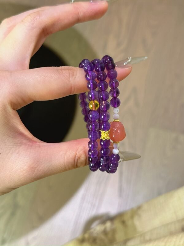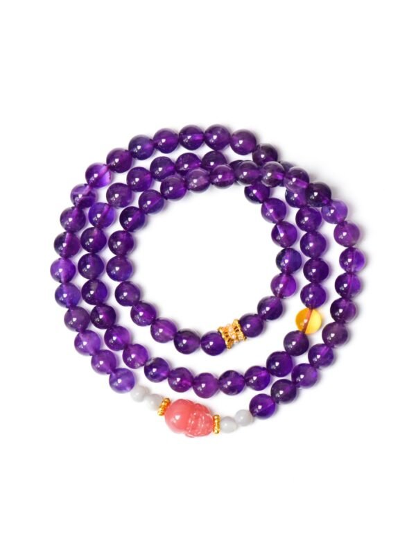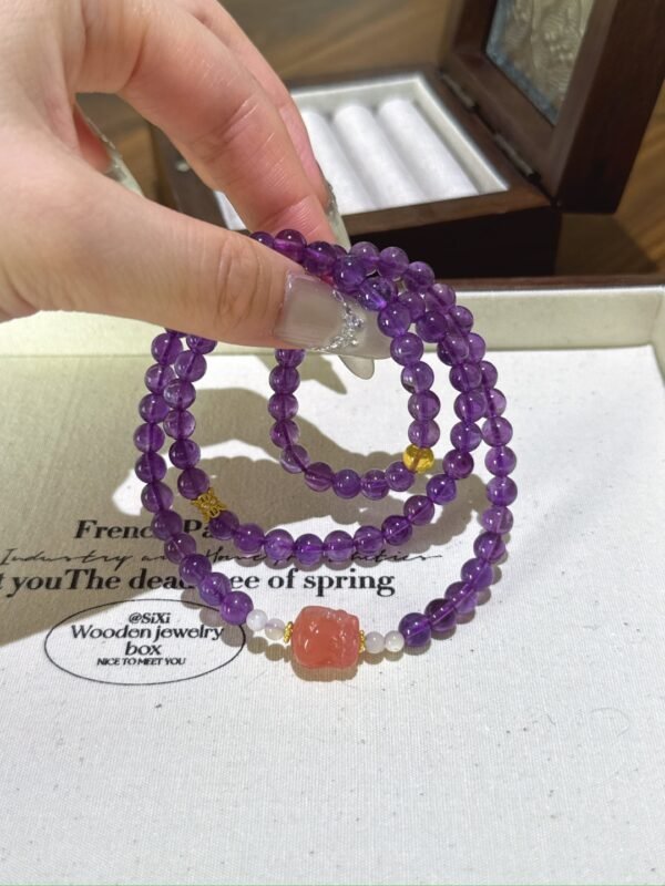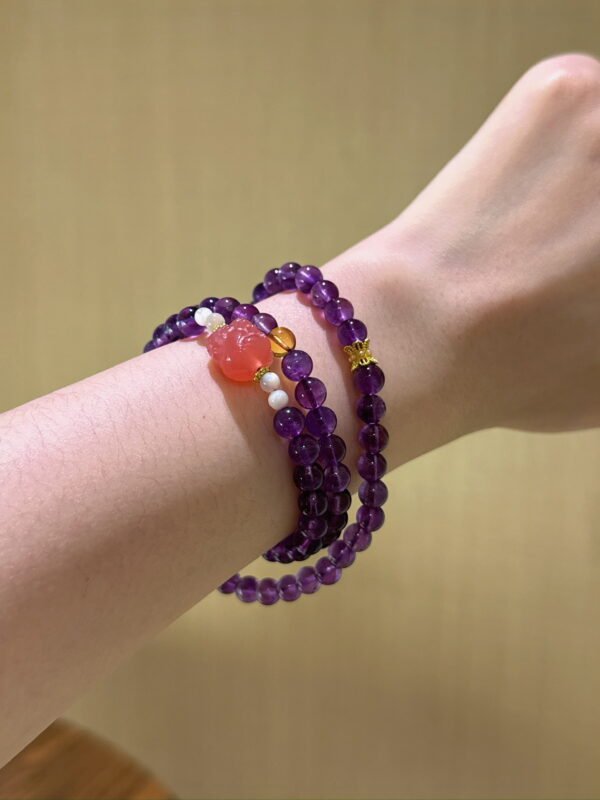 The double-ringed amethyst design exudes a gentle yet powerful aura. Paired with blue amber and the playful Yanyuan agate Pixiu, it creates a graceful and elegant look. Amethyst helps relax the mind, improve sleep, and sharpen the intuition; blue amber is a powerful stone for attracting wealth, attracting sources of income and enhancing motivation; and the Pixiu, guarding wealth, symbolizes holding onto money and ensuring financial stability! Those experiencing recent fluctuations in their fortunes shouldn’t miss this!