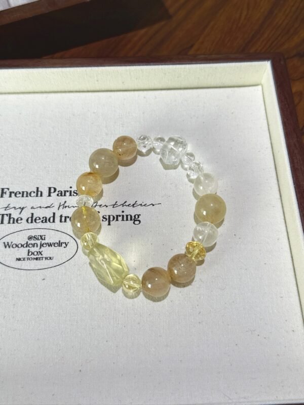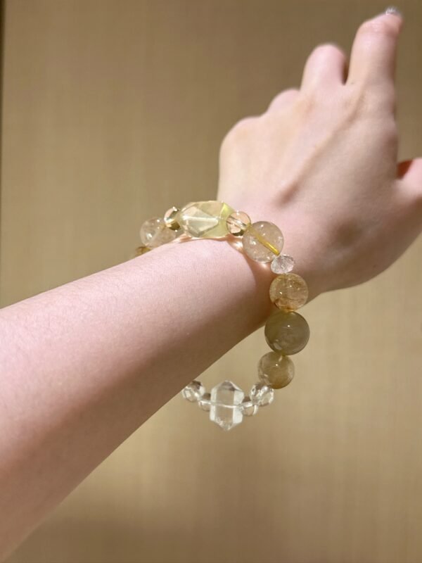 This bracelet features a combination of golden quartz, white ghost, lemon yellow, and white water double-pointed quartz. It’s visually clear yet aura-enhancing. The overall design is clean and elegant, and it feels incredibly powerful when worn! Golden quartz attracts wealth, boosts career success, and strengthens confidence; white ghost aids career advancement and eliminates negative influences; citrine enhances logic and concentration, making it ideal for those with chaotic thoughts. White crystal purifies the entire situation and has an overall strengthening effect. This bracelet is suitable for those preparing for a transition or career advancement, especially for presentations requiring a thesis defense, as it helps you communicate clearly and express yourself confidently.✨