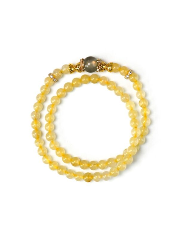 Golden Rutilated Quartz paired with Gray Moonlight’s fine double-bead design creates a particularly gentle and intellectual look. The Gray Moonlight’s understated elegance and subtle shimmer create a luminous and translucent bridal quartz, perfectly capturing the perfect balance of strength and softness! This bracelet perfectly accentuates a refined and feminine look! Golden Rutilated Quartz represents luck with benefactors, unexpected financial gains, and enhances career focus; Gray Moonlight soothes emotions, alleviates insomnia, and promotes emotional and inner harmony. Ideal for those with mood swings and delicate minds.