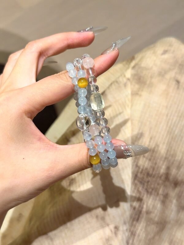 Featuring Aquamarine’s clear light blue as the foundation, resembling spring morning ocean with refreshing healing quality. Paired with Rose Quartz’s soft pink that adds sweet filter to Pisces’s emotions. Accented by Clear Quartz and Raw Citrine like scattered starlight, adding灵动and abundance, while Tiger’s Eye’s deep luster adds bold protection to the romance.