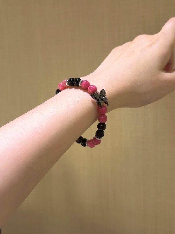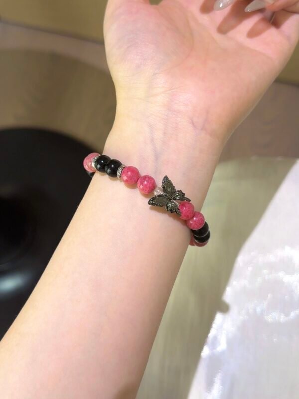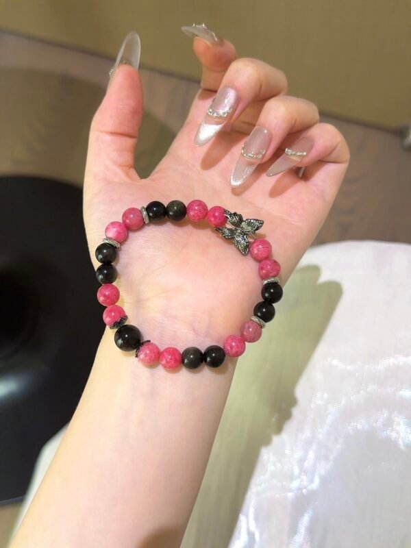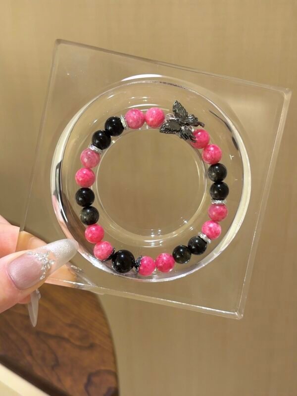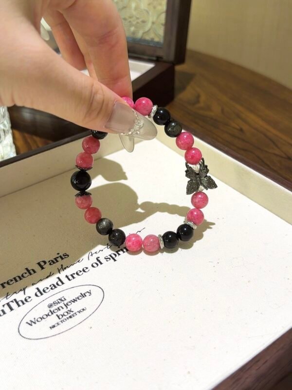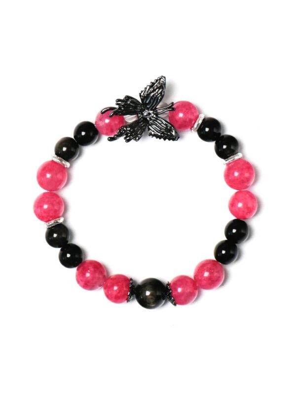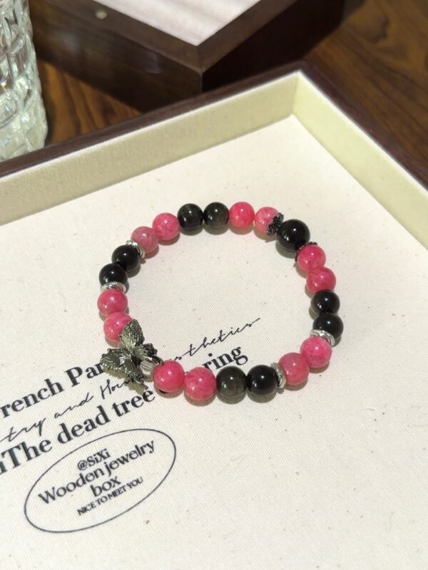 The vibrant rose quartz paired with the profound gold obsidian, accented by a gun-black butterfly, creates a sweet and cool charm! Rhodonite can help us see clearly amidst confusion and heal emotional wounds, while gold obsidian is considered a powerful amulet, warding off evil, protecting health, and attracting wealth! – Materials: Rhodonite, Gold Obsidian, White Quartz Size: 8m/10m