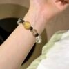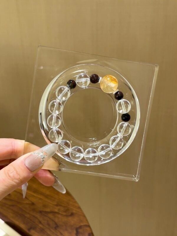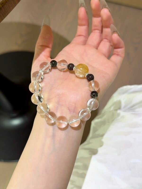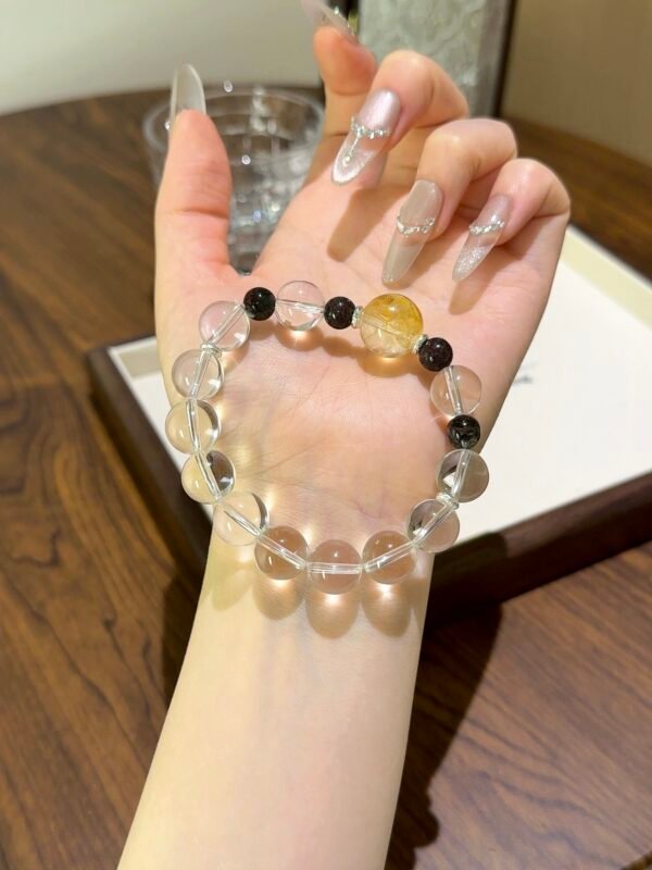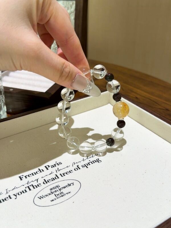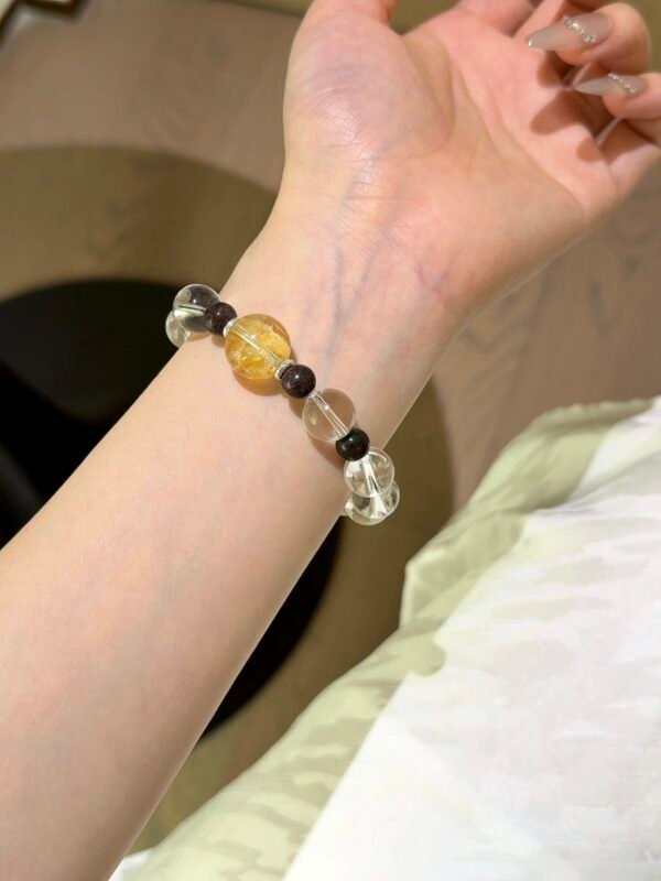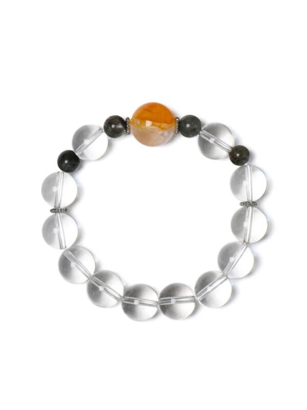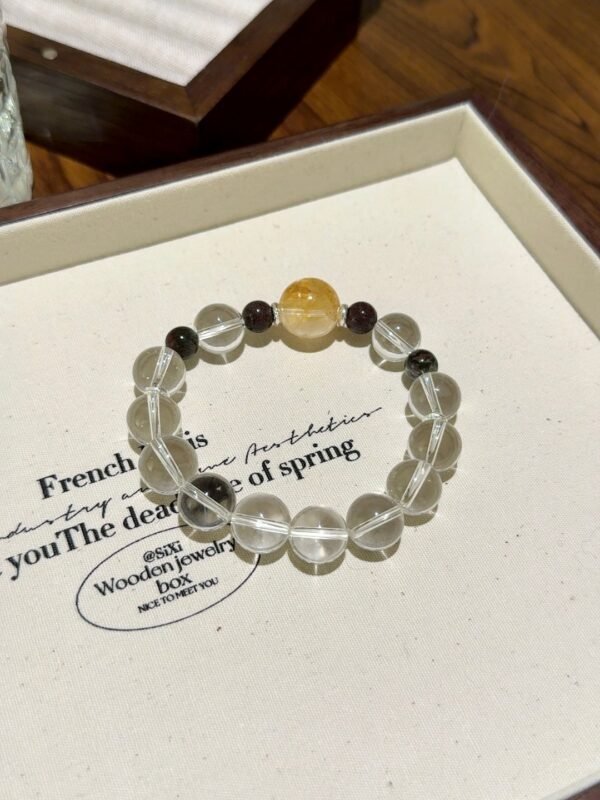 White crystal, green phantom, and yellow gum flower combine their powerful energies, adding a touch of neo-Chinese design. 👍The purity of white crystal helps clear negative energy, while green phantom can bring a leap forward in the wearer’s career. The warm glow of yellow gum flower helps reduce stress and increase vitality!
