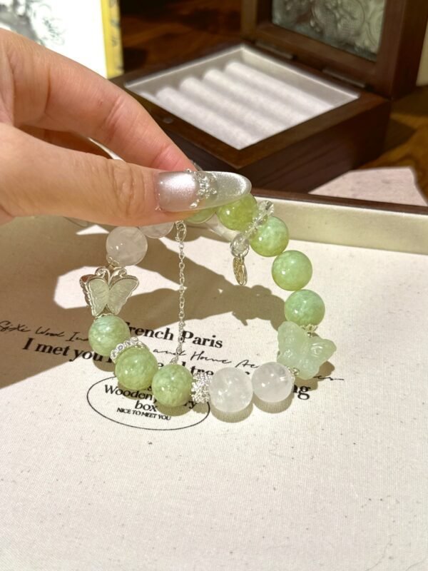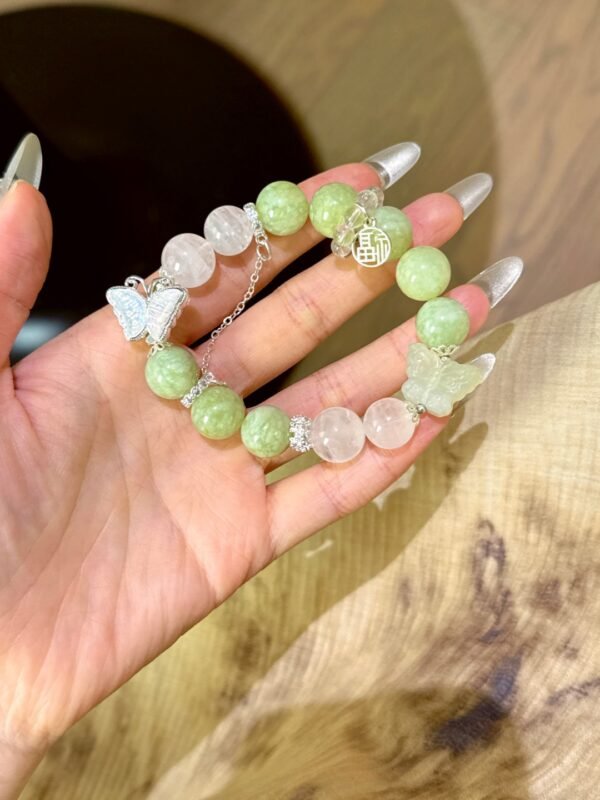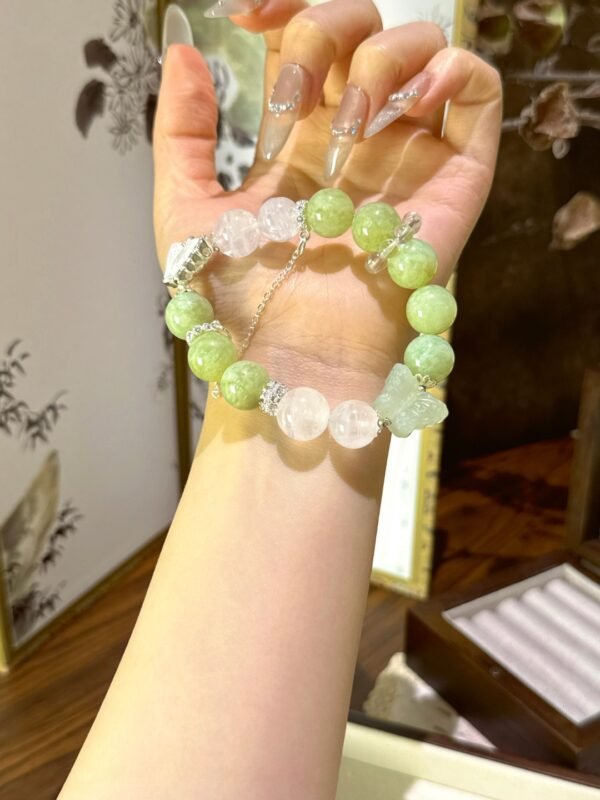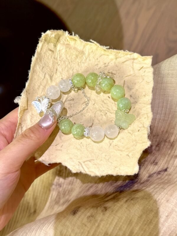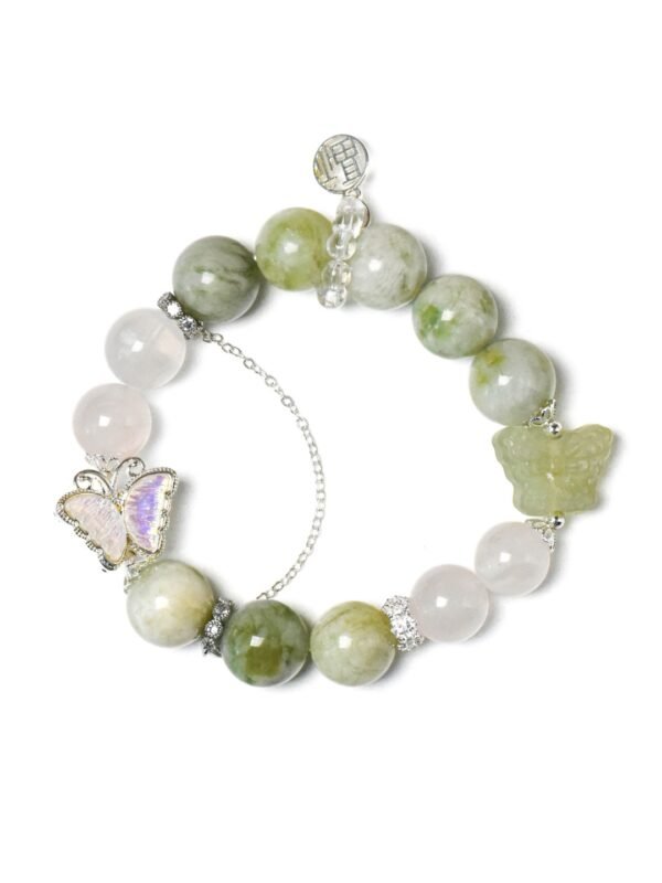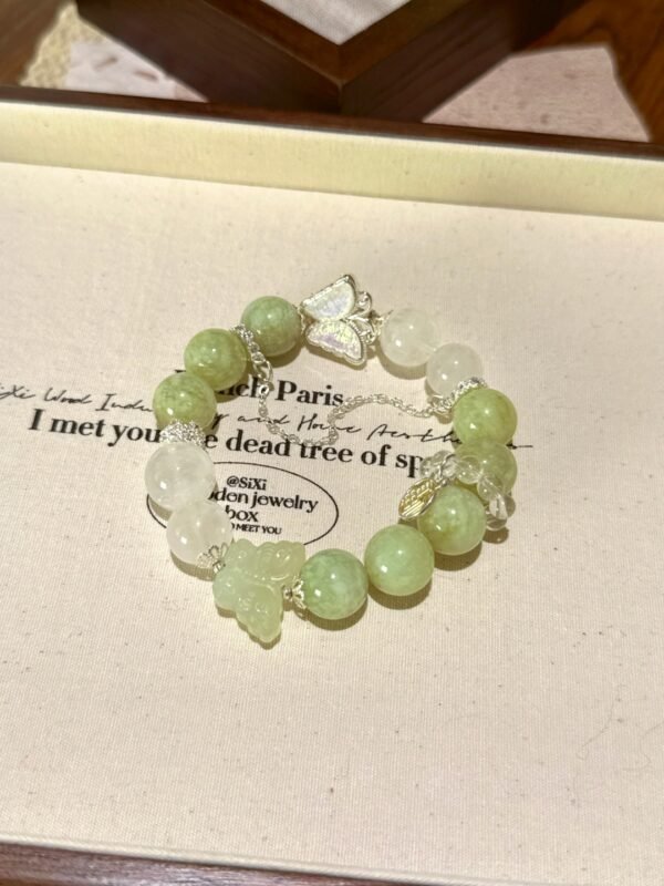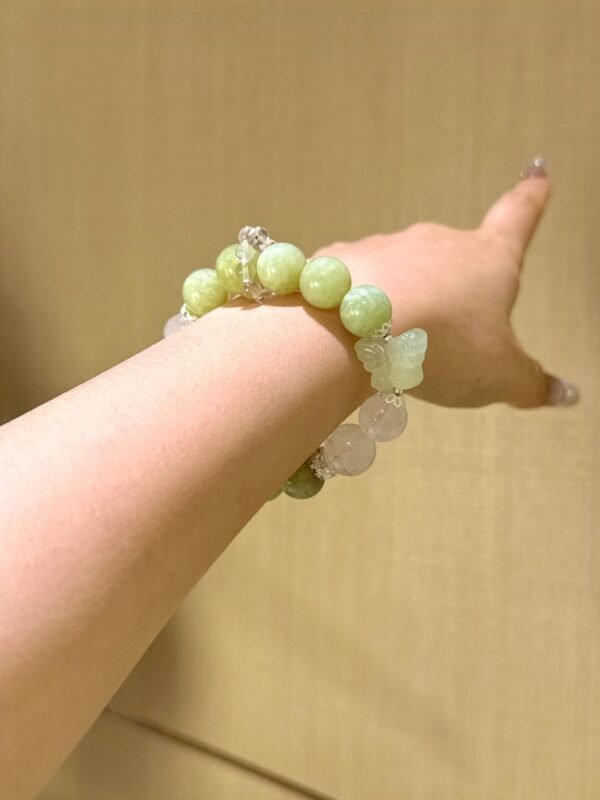 This Xiuyan jade bracelet features a white ghost, a Xiuyan jade butterfly, and a white crystal running ring, creating a fresh and natural design that exudes a forest-like feel. 🌱 Xiuyan jade promotes health. Its green energy helps relieve tension and nourish the body and mind. It also possesses a powerful protective effect against negative influences, shielding the wearer from external influences. The white ghost symbolizes positive wealth, bringing new growth to our careers. The white crystal enhances overall energy flow and purifies the surrounding magnetic field.