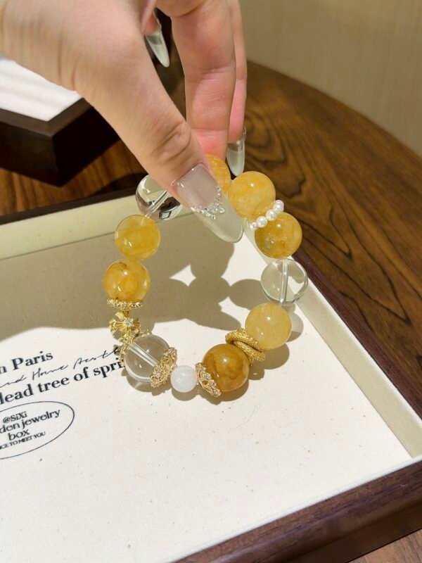 Combining traditional aesthetics with modern design, the yellow gum flower brings good luck and prosperity, while the white crystal helps purify the magnetic field, protecting the wearer from surrounding negative energy.