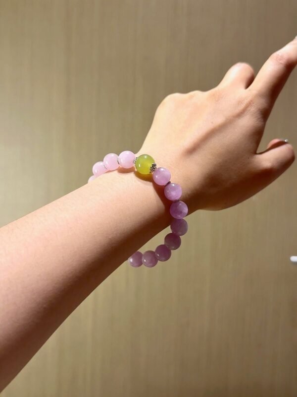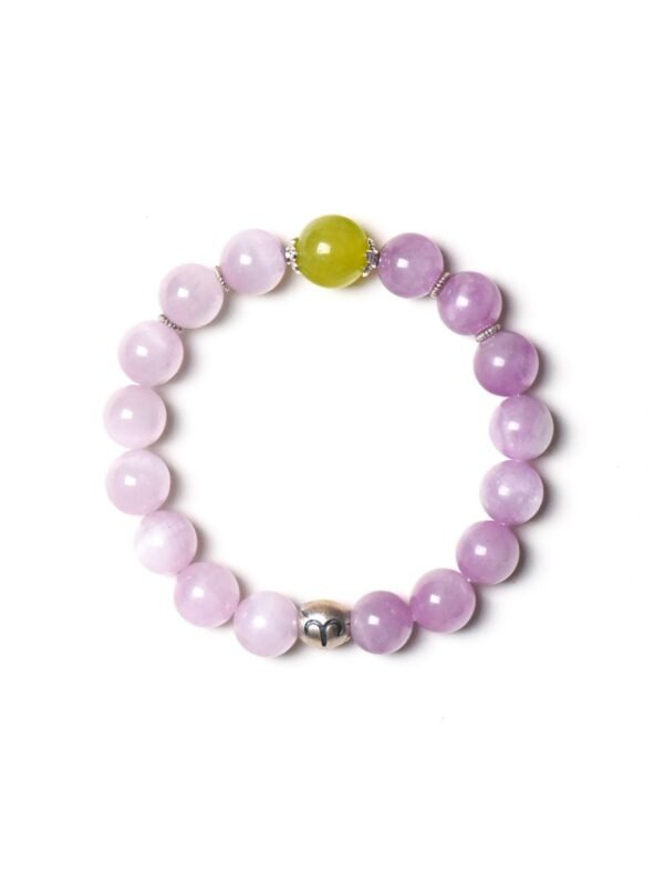 Featuring gradient shades of Kunzite (from soft lilac to deep purple) and a central apple-green Xiuyan Jade master bead, this bracelet visually and energetically represents the integration of fire (Aries), water (emotional flow), and wood (growth). The silver zodiac spacer adds a celestial touch, making it a meaningful and elegant accessory.
