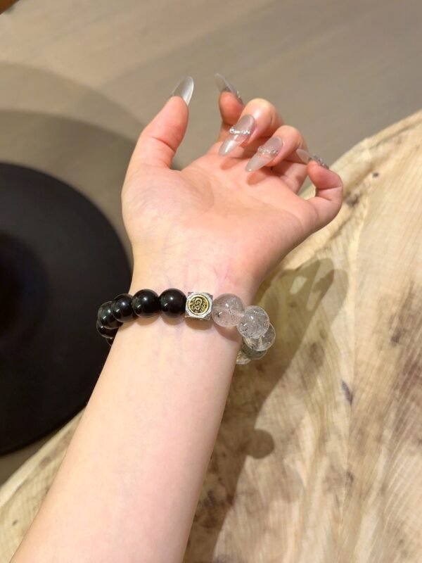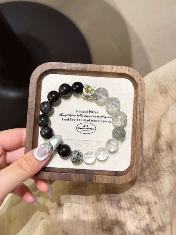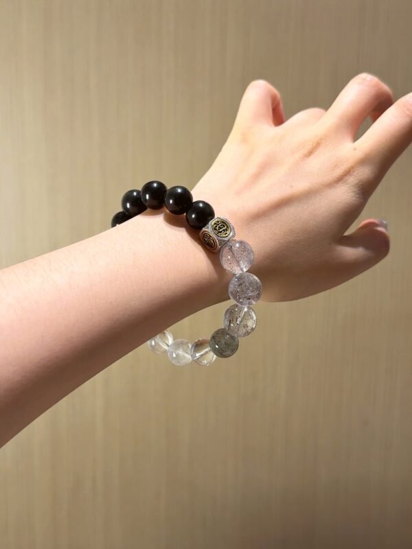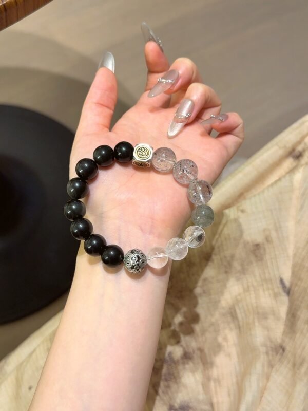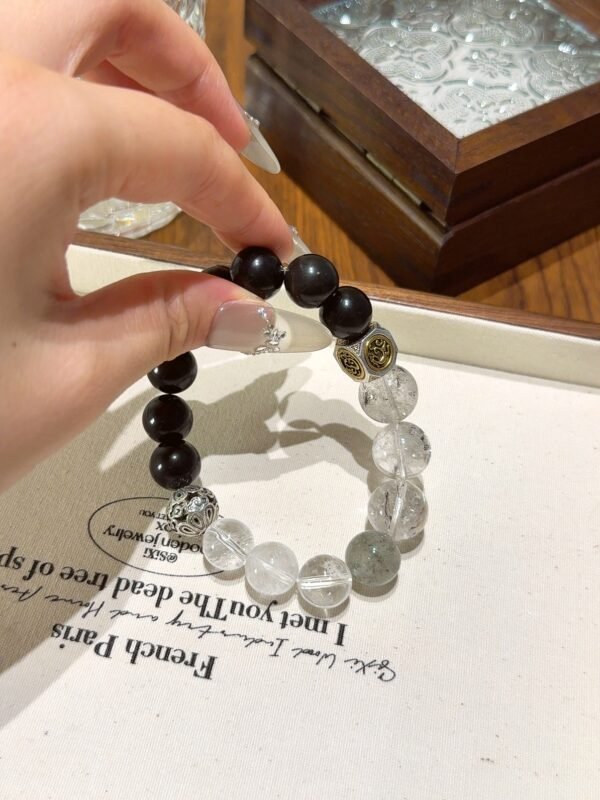 Half is as dark as ink, half is as clear as light. The interweaving of positive and negative energies creates a powerful shield. The classic combination of Obsidian, White Crystal, and Shining, paired with carved alloy beads, is simple yet substantial, perfect for those seeking mental stability and energy protection.