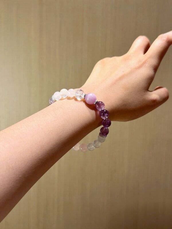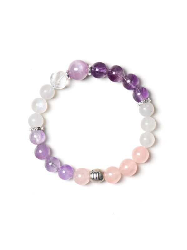 Featuring a sophisticated gradient of purple tones—from deep amethyst to soft kunzite—accented with rose quartz, moonstone, and uniquely carved clear quartz twist beads. The silver zodiac charm adds a celestial touch, creating a piece that embodies “quiet luxury” while delivering profound energetic support.