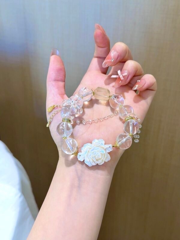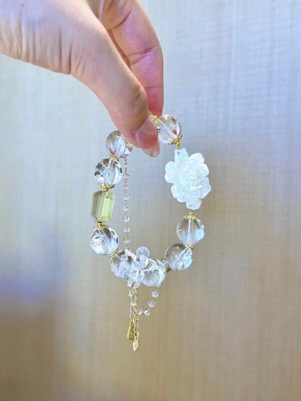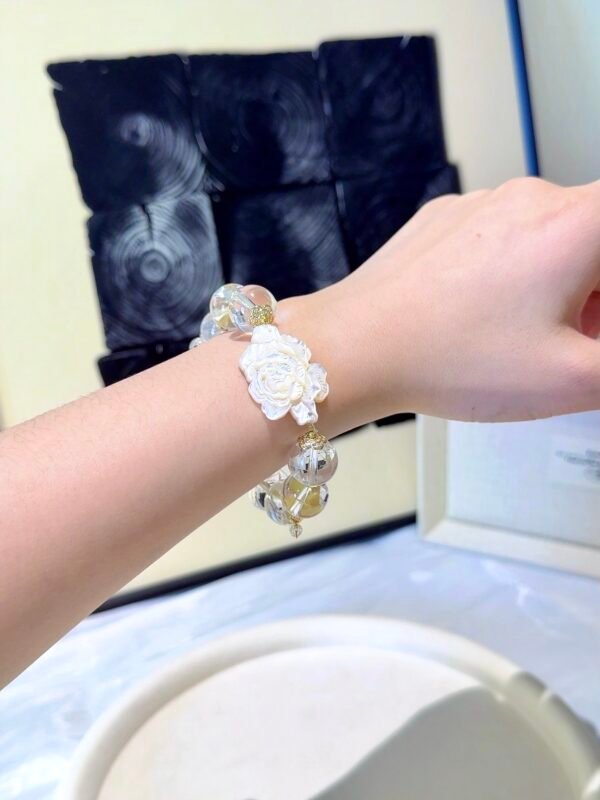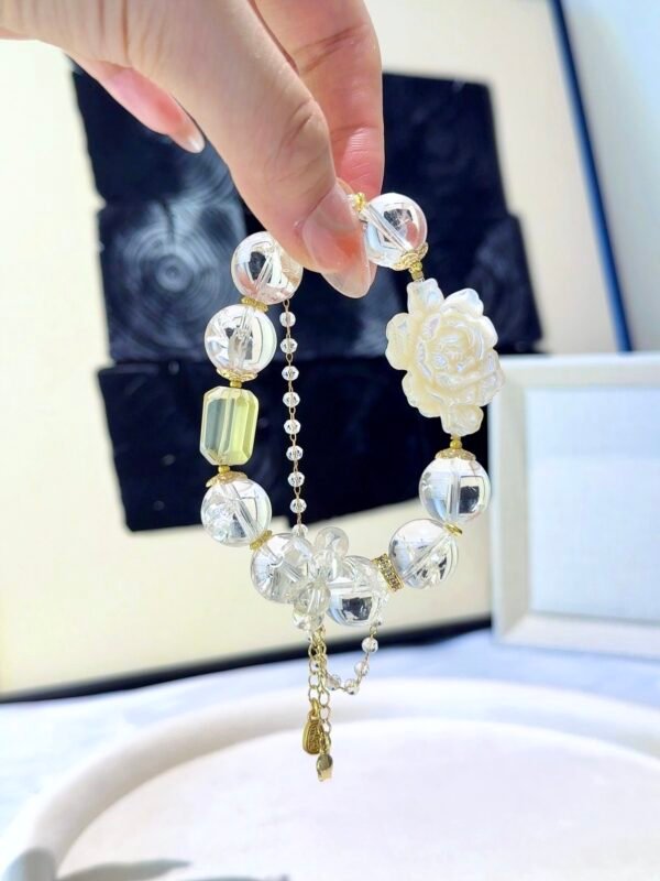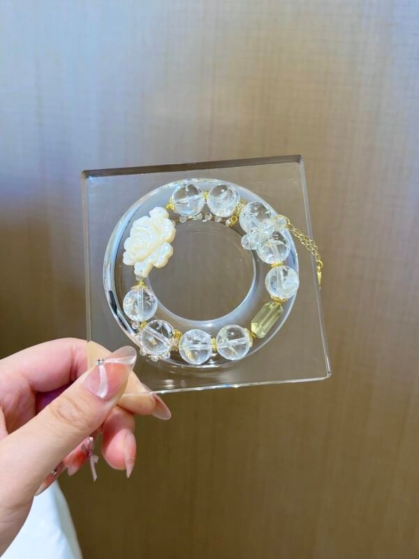 一款优雅的手链。通透的白蜡木搭配温暖的黄水晶方块,营造出精致时尚的氛围。